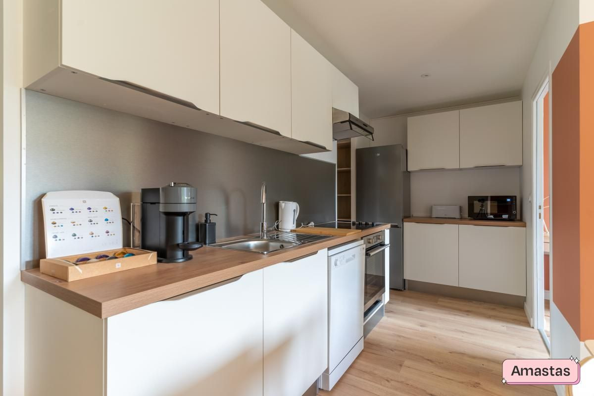 - Cuisine avec plaques de cuisson, hotte, micro ondes, frigo et tous les éléments utiles à l’entretien de l’appartement (aspirateur, serpillère,...)