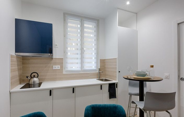 Entrée avec rangement, séjour, cuisine équipée (Hotte, plaque de cuisson, micro-onde, lave linge, kit vaisselle ), une chambre, salle d'eau avec sèche serviette et wc.