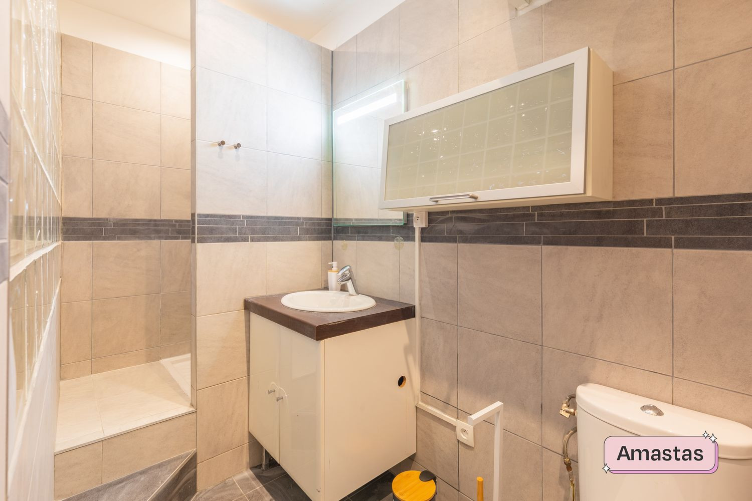 - 1 salle de bains avec grande douche, meuble vasque, miroir, évier et WC