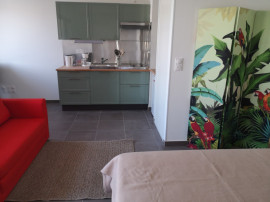 avec cuisine ouverte intégrée neuve et équipée (réfrigérateur , four top, hotte, plaque à induction, cafetière , bouilloire, couverts et vaisselle, ustensiles de cuisine adaptés pour 4 couverts ).lave linge table haute avec 2 chaises hautes bar