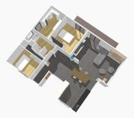 - Pièces : 2 chambres, 1 bureau/dressing, 1 salon/salle à manger, cuisine ouverte