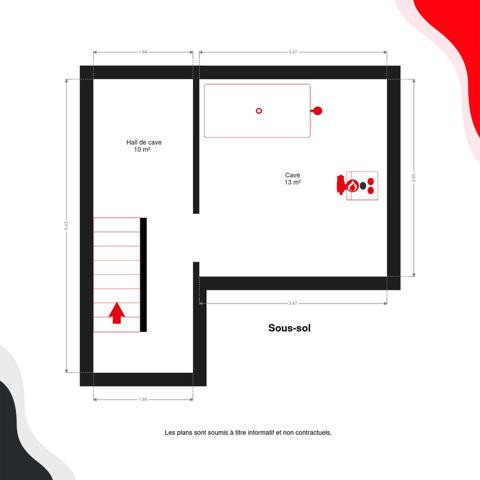 1er étage : hall de nuit, 2 chambres de 12 m², salle de bains et bureau.